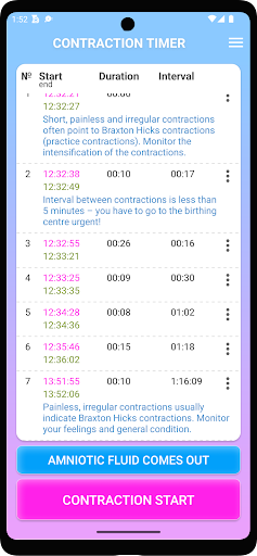 The Easy Contraction Timer app for Android makes timing your contractions simple. Just press start when a contraction begins and stop when it ends. The app keeps track of how many contractions you've had and how long they last. This information can be shared with your doctor to assist during labor. The newest version of the app also allows you to monitor the intensity of your contractions and view an informative chart. You can edit or resume a contraction if needed and easily delete them by swiping. You can also share your contractions with loved ones through a summary or live stream. Good luck with your labor!